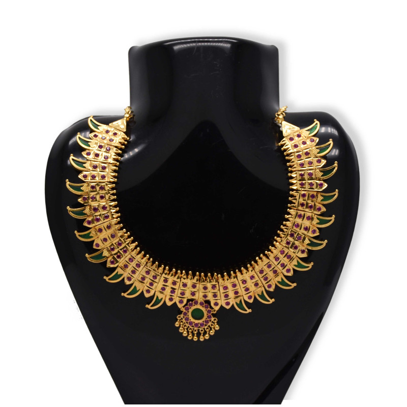 One Gram gold plated Kerala Traditional Palakka type chocker. It's called Pulinaga thali (Leopard Claw). It has adjustable Back chain. It is worn by Brides. Also any women with Sarees or ethnic wear it will add a Beauty. This necklace also worn by Traditional Dancers.