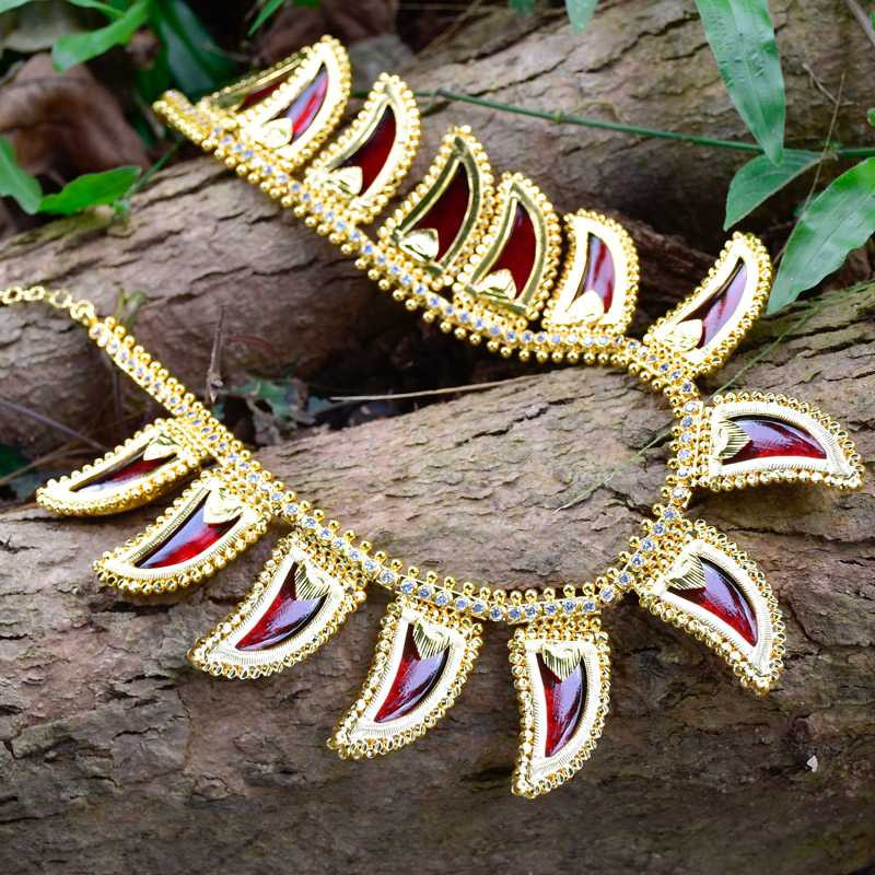 One Gram gold plated Kerala Traditional Red enamel big pulinakham necklace. It has an adjustable Back chain. It is worn by women with Sarees or ethnic wear. This choker necklace also was worn by South Indian brides and Traditional Dancers.
