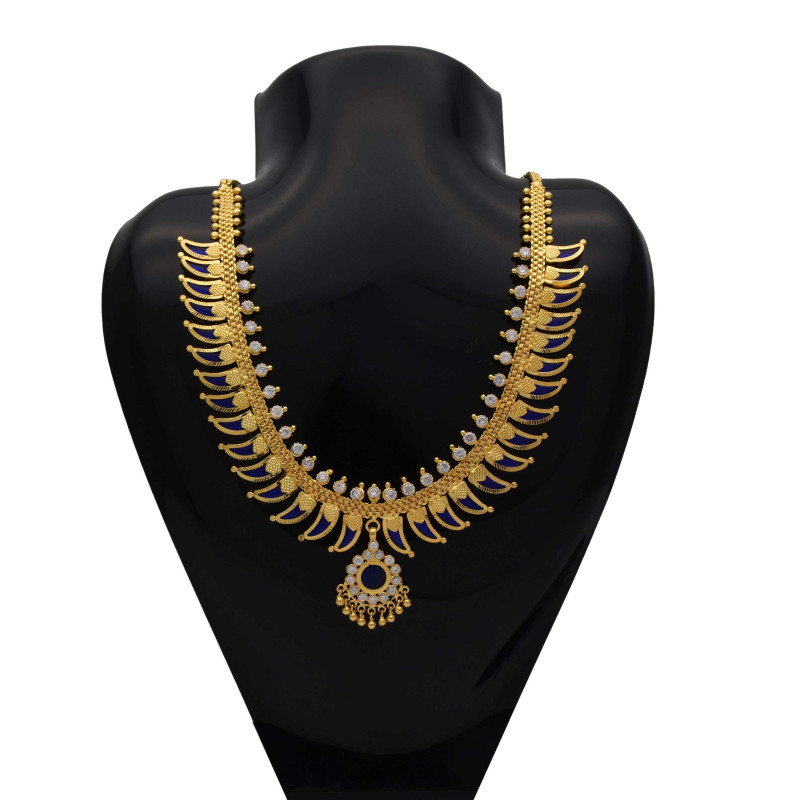 This traditional Leopard claw/Pulinakham Necklace is simple and ethnic South Indian, Kerala Jewellery. This Jewelry has been arranged beautifully with Leopard-claw shaped glass stones. Small round pendant have golden bead hangings. Length can be adjusted with back link chain. It is best suited for festive occasions, Marriages and as Bridal wear and dance wear.