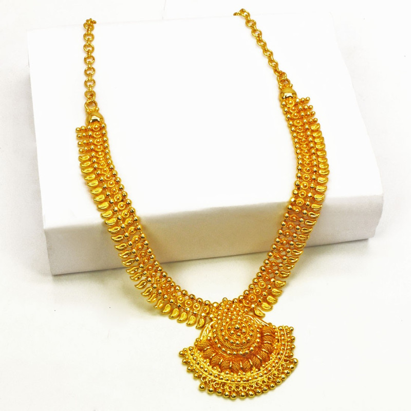 Adorable Gold Plated Designer Mesh Leaf Necklace for women. This elegant golden necklace has a mesh pendant with ball hangings and back adjustable link chain. Team it with any outfit on Marriage functions or any special occasion.