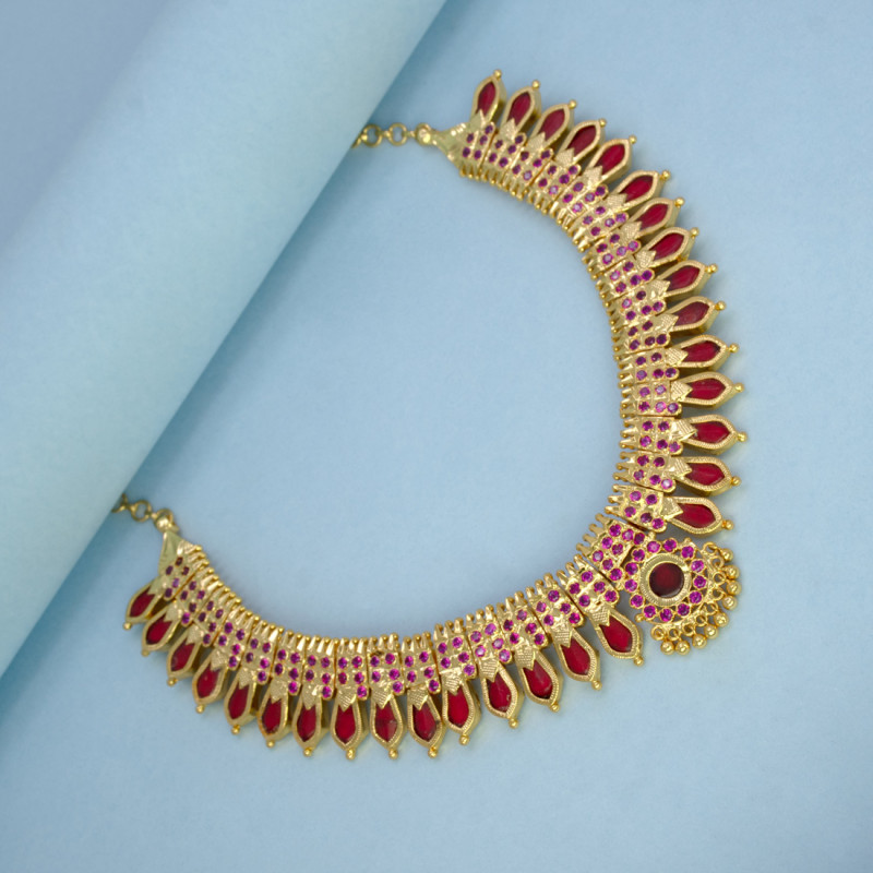 Each necklace is meticulously crafted with one gram gold, featuring an adjustable back chain that ensures a comfortable fit with any traditional attire. Whether worn with a classical dance costume, bridal ensemble, or during festive celebrations, this versatile choker necklace will enhance your beauty and cultural pride.