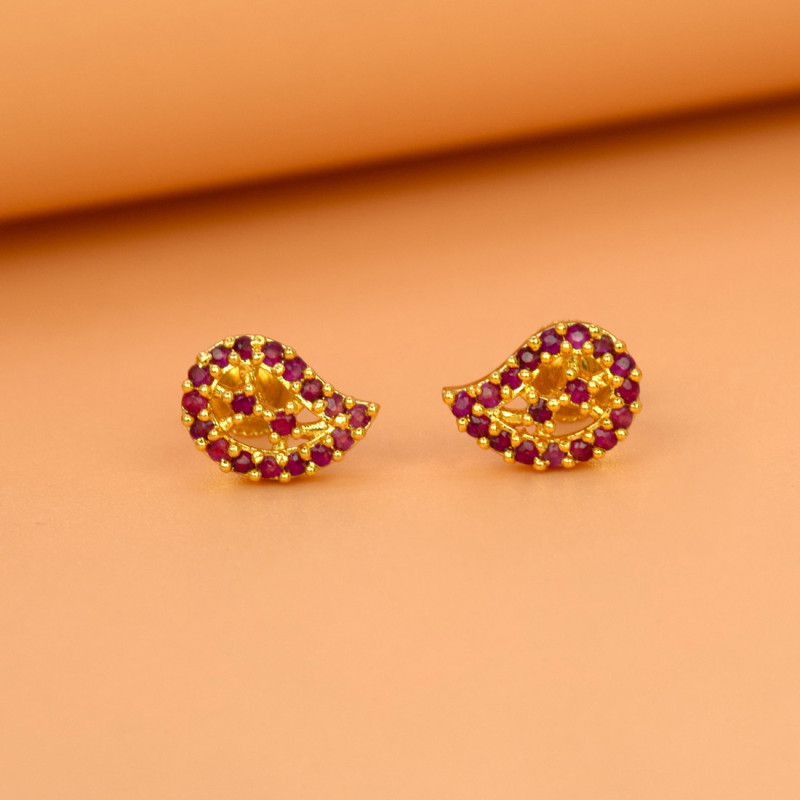 Stunning Gold Plated Ruby Stone Mango Paisley Ear Studs for girls and women. Perfect ruby stone studded mango design earrings for ethnic, bridal, and festive occasions. Screw type back.