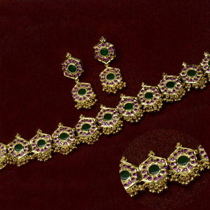 Traditional Trendy Green Enamel Ruby Collar Necklace Set is beautiful traditional jewellery made in contemporary style. One gram Gold Hexagon shaped motifs have green round enamel stone encircled with ruby stones and golden ball danglers. It has matching earrings and an adjustable Back chain. To any age sleek woman with Sarees or ethnic wear, this choker will add a classic touch.